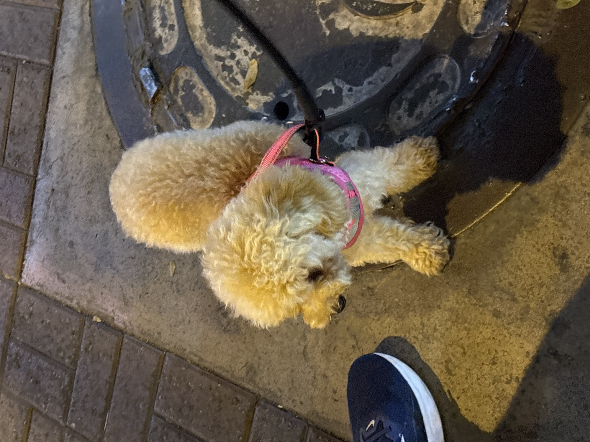 A tan, curly-haired dog, likely a poodle mix, lies on a gray sidewalk. The dog is wearing a pink harness and is attached to a black leash. A dark blue shoe with a white sole is visible in the lower right corner of the image. The sidewalk is composed of dark gray rectangular pavers on the left. Adjacent to the dog is a circular metal manhole cover with a dark, textured surface. The scene is illuminated with an unknown light source that casts a shadow to the upper right of the manhole. The specific location in Miraflores, Peru cannot be determined without additional information such as street signs or distinctive landmarks.