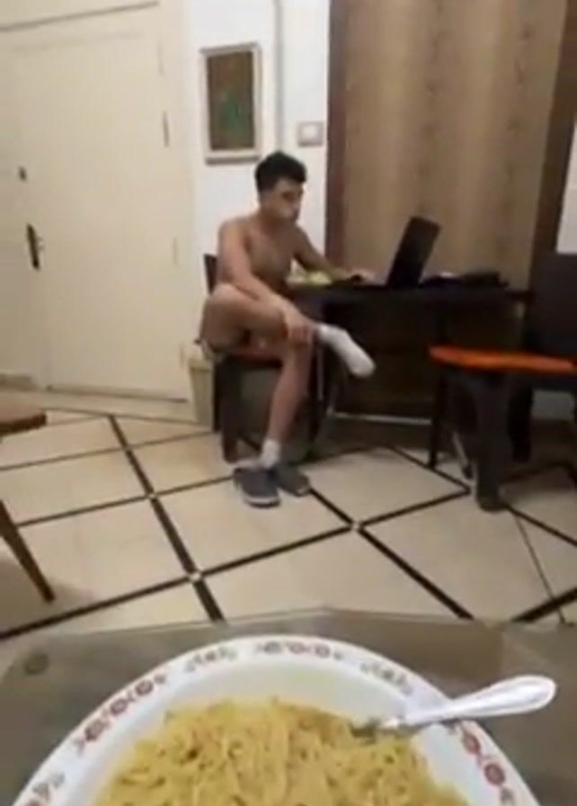 A video shows an interior scene. A plate of yellow noodles sits in the foreground. The camera pans to reveal a young man seated at a desk in the background. He is shirtless and wearing patterned shorts, one white sock, and gray sandals. He is sitting with one leg crossed over the other and is working on a laptop. There is a partially visible room divider behind him. The floor is tiled with a light color, and black tape divides the tiles into squares.