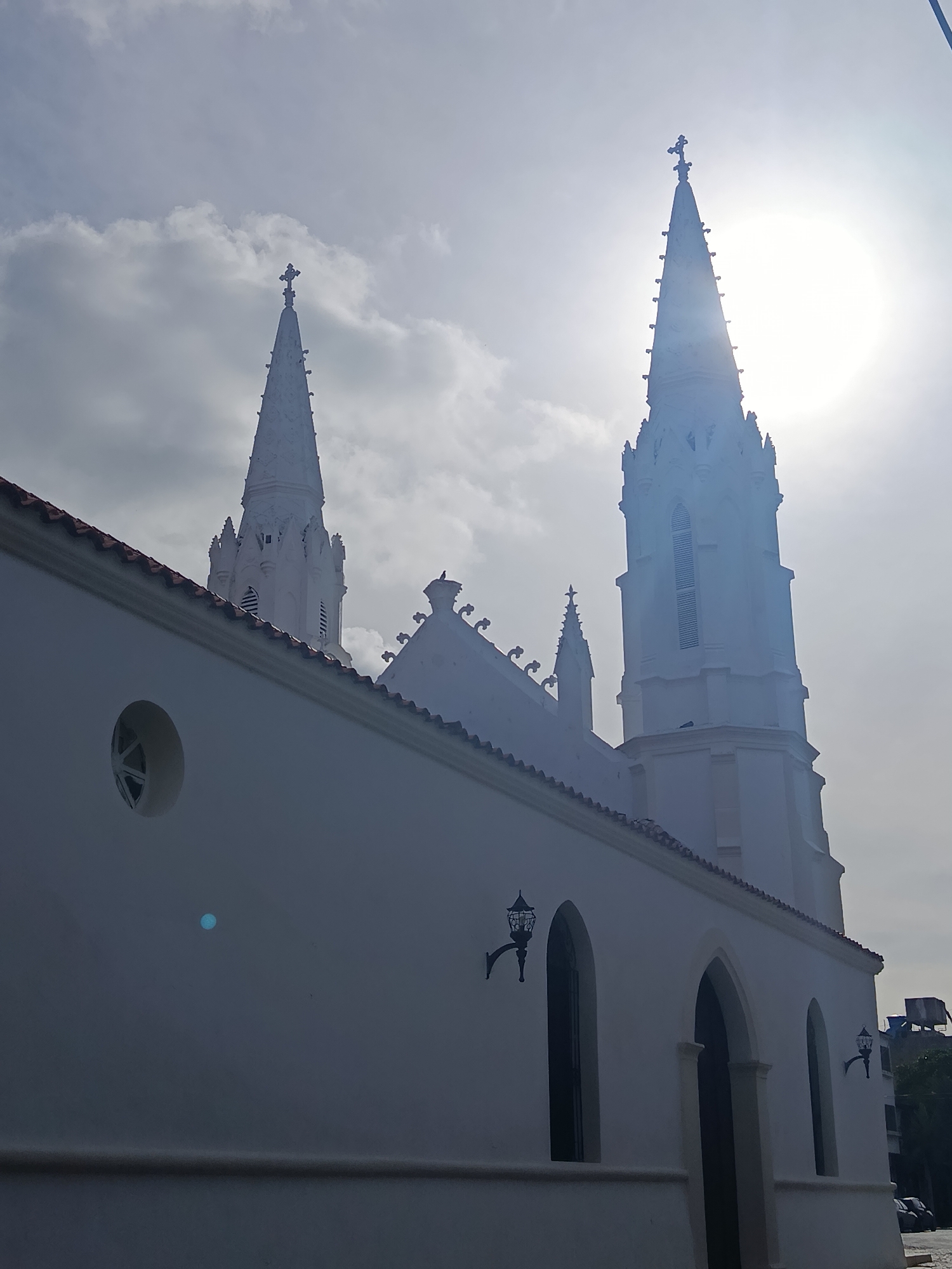 The image depicts the Iglesia Inmaculada Concepcion (Immaculate Conception Church) in Juan Griego, Venezuela. Two tall, white, Gothic-style spires with crosses atop them rise against a bright, sunlit sky with some scattered clouds. The sun is positioned behind one of the spires, creating a strong backlight. In the foreground, a section of the church's white exterior wall is visible, featuring a row of arched windows, decorative wall-mounted lamps, and a small circular window. The wall has a red tile roof. A water tank is visible in the background. The scene is daytime.