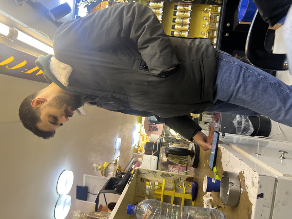 Barza Municipality, Syria. An indoor commercial establishment is depicted, focusing on a male subject interacting with a smartphone at a counter. The subject has short dark hair and a beard, wearing a dark olive-green puffer jacket with a light-colored faux fur collar over a green hoodie, and blue denim jeans. His right hand is positioned over the screen of a horizontal smartphone with a green protective case, which rests on a worn white counter. His left hand is in his jacket pocket. On the counter, a metal ashtray contains several cigarette butts, a blue and white paper cup is present, and a clear plastic water bottle with a blue cap and Arabic text on its label stands upright. A purple cylindrical object lies between the bottle and the cup. The counter surface exhibits wear and some dark staining. Behind the counter on the left, open shelving units display various items. These include multiple clear glass decorative bottles, a small terracotta pot, and a black rectangular electronic device. Further back, shelves hold yellow compartmentalized trays filled with numerous small clear bottles, likely containing liquids. A clear glass beverage dispenser with a spigot and a black electric kettle are also visible, emitting a light vapor. To the right, a yellow display rack features multiple rows of uniform gold-colored aerosol cans, some labeled 'ALLAM'. Below these, clear glass perfume bottles with gold caps are arranged on a dark shelf. An overhead sign with yellow Arabic script and the partial English text 'GOLDRAISH' is visible. The area is illuminated by two circular ceiling lights on the ceiling. A black waste bin with a clear plastic liner is partially visible on the floor below the counter on the right.