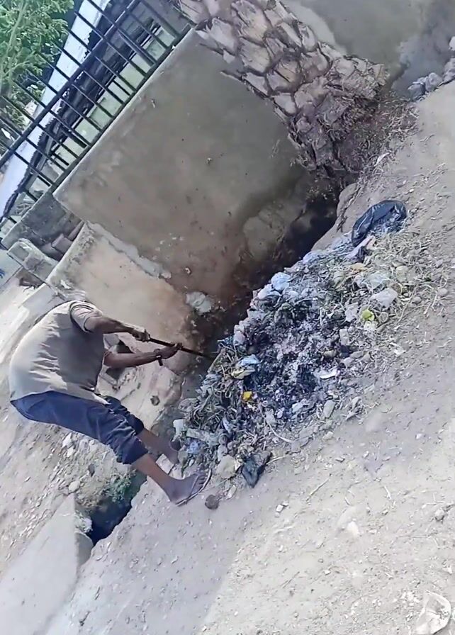 A man in a short-sleeved shirt and dark cropped pants uses a long tool to poke at a pile of trash and debris. The trash is next to a low concrete wall and a drainage ditch in a dirt area next to a paved road. In the background are buildings and trees. Several people walk by in the background.