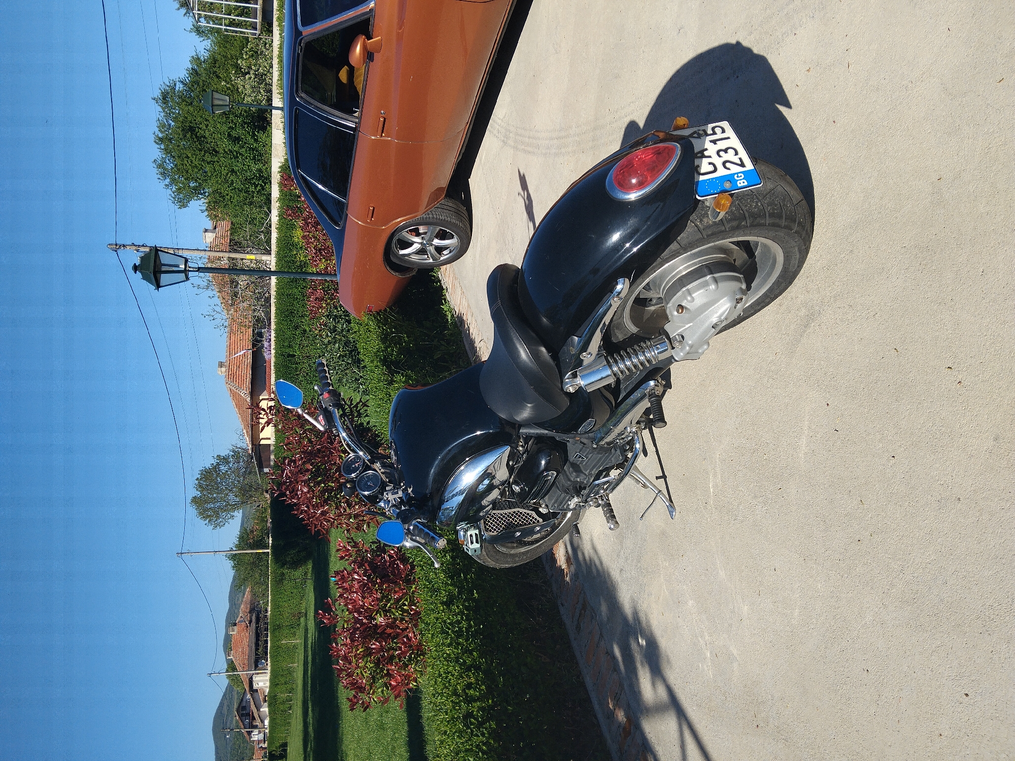 A motorcycle is parked on a concrete surface next to a brown car. The motorcycle has a Bulgarian license plate that reads "CA BG 2315." Behind the motorcycle and car, there is a green hedge and a red-leafed bush. In the background, there is a row of houses with orange tile roofs and a blue sky. This scene is located in Asenovets, Bulgaria.