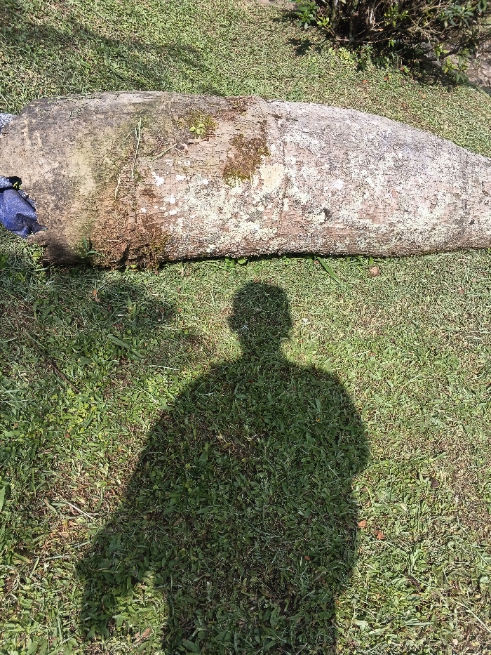 This image captures an outdoor scene in Laclubar, East Timor, under direct sunlight. A large, weathered tree trunk, horizontally oriented, occupies the mid-ground, resting on green grass. The trunk's bark displays a rough texture, mottled with light grey, brown, and patches of green moss or lichen. At the far left end of the trunk, a crumpled piece of blue fabric is partially visible. The lower half of the frame is dominated by a distinct, dark shadow of a human figure, likely the photographer, cast upon the vibrant green grass. The surrounding environment consists of short to medium-length green grass, with indistinct green foliage visible in the distant background, suggesting a natural or semi-natural setting.