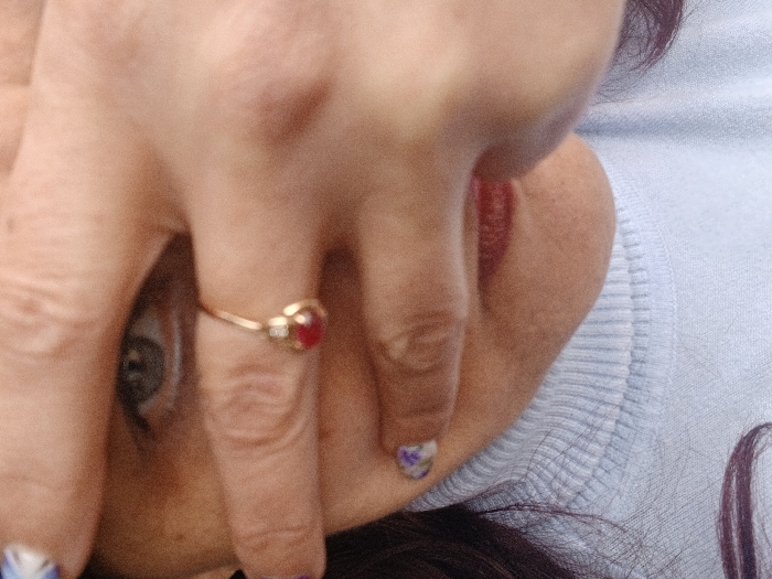 An individual is depicted in Vratsa, Bulgaria, in a close-up, chest-up shot. The subject, likely female, is partially obscuring their face with their right hand, held horizontally across the upper face. A single light-colored eye, with a visible pupil and iris, is visible through the gap created by the fingers, looking directly towards the viewer. The visible lower portion of the face shows the nose, mouth with red lipstick applied to the lower lip, and part of the chin. Dark hair is visible along the lower left and right edges of the frame. The hand features a thin, gold-toned ring on the ring finger, adorned with a small, circular red gemstone and a tiny, clear accent stone. The fingernail on the pinky finger (partially visible) displays a light-colored polish with purple and white floral designs, while the thumbnail (upper left corner) has blue and white patterned polish. The subject wears a light blue, ribbed turtleneck garment. The background is out of focus and indistinct, providing no environmental details.