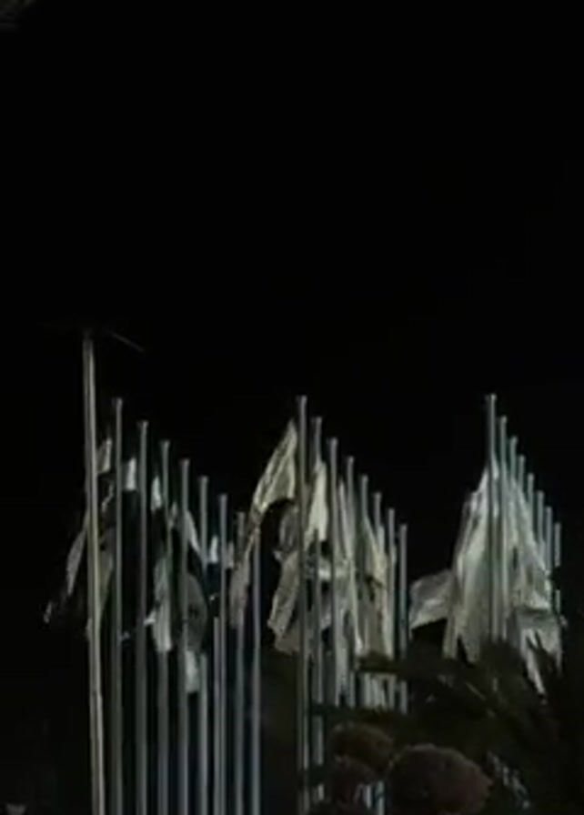 Here is a detailed description of the video: The video shows a nighttime scene in what appears to be a public area. There are several people standing and walking around. They are mostly grouped together, some conversing. The area is illuminated by streetlights, which cast a glow on the scene. In the background, there are buildings with lights on. In the immediate foreground is a small patch of grass, and beyond that, a cluster of flagpoles with flags fluttering in what could be wind. The flags are light-colored. The camera pans slightly, revealing more of the surroundings and the other people present. There are modern architectural structures visible.