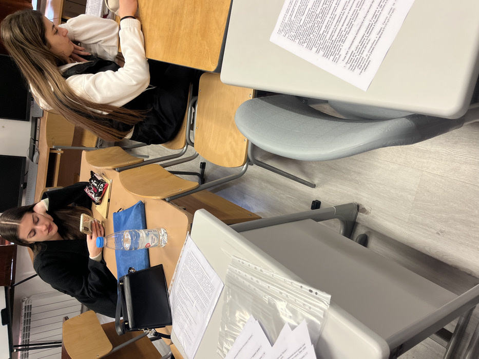 This image depicts an interior view of a classroom or computer laboratory, located in Kotel, Bulgaria. In the middle ground, two young adult females are seated at individual light brown wooden desks, each using a wooden chair with a metal frame. The female on the left, with long dark hair, wears a dark cardigan over a light shirt, holding a light-colored smartphone in her right hand while resting her left elbow on the desk, looking at the device. On her desk are a black shoulder bag, a clear plastic bottle of Izvor mineral water with a blue cap, a dark blue fabric pouch, and a small red and black patterned item. The female on the right, also with long dark hair, wears a white long-sleeved top over a dark vest and pants, with her right arm resting on the desk as she looks down. In the immediate foreground, a white desk with a light grey frame displays several sheets of white paper with black text and a stack of clear plastic sheet protectors. A grey ergonomic chair is partially visible to the right of this desk. The background reveals additional wooden desks and chairs, along with two dark computer monitors, against a white wall with a radiator. The flooring is light grey wood-look laminate or linoleum.