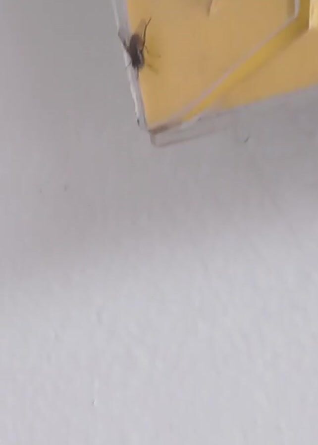 The video depicts a fly perched on the corner of a yellow and transparent rectangular object, positioned against a white wall