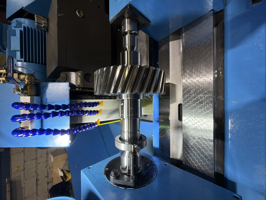A close-up showcases a metal gear, its helical teeth prominently visible, centrally positioned on a metal rod held by a machine