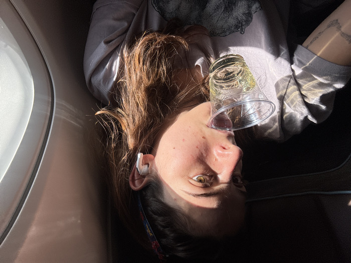 A female individual is prominently featured in an airplane cabin, seated alongside a window on her right. She possesses long brown hair and fair skin with minor facial blemishes, and her hazel eyes are directed towards the viewer. She is wearing a multi-colored headband and a light-colored t-shirt with a dark graphic. A white wireless earbud is placed in her right ear, and a tattoo outline is visible on her left forearm. She is in the act of drinking from a clear plastic cup, which holds a light yellow liquid approximately one-third full, with her tongue visible at the rim. Strong, directional sunlight streams through the airplane window, brightly illuminating the right side of her face and upper body, casting distinct shadows. The environment is consistent with an aircraft interior; the specific city of Unknown, Israel, cannot be determined from this visual information.