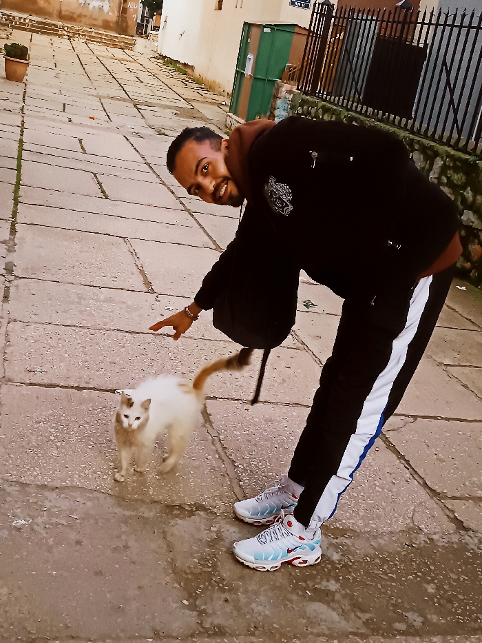 A man bends forward with one hand pointed toward a white cat with orange markings on its head and tail. He wears a black sweatshirt, black sweatpants with a white stripe, and light-colored sneakers with red accents. The cat stands on a cobblestone surface. In the background, there are buildings and a metal fence. A small potted plant sits near the top left corner.