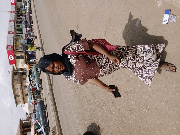 An outdoor street scene in Communauté rurale de Payar, Senegal, is depicted under daylight conditions with an overcast sky. In the foreground, a woman walks on a paved street, moving towards the mid-right. She wears a long dress featuring a dark brown bodice with speckles and a skirt patterned with white and purple concentric circles. Her head is covered by a black headscarf, and she wears dark flip-flops. A maroon shoulder bag hangs from her left shoulder, and she holds a dark-colored smartphone in her right hand. Her facial expression is neutral. On the asphalt near her feet are a white packet with blue text, a clear plastic bag containing small items, and a rectangular piece of paper. The midground and background reveal a multi-lane paved road bordered by a concrete curb. Several vehicles are present, including a dark grey sedan, a light green sedan, and a maroon sedan. On the right side of the street, a two-story commercial building displays multiple prominent "itel" branded signs (red text on white backgrounds). To the left, a market area is visible with vendors positioned under umbrellas. Various individuals are walking or standing along the street and sidewalks, including a person in a yellow-green shirt walking across the background road from right to left. Additional multi-story buildings, some featuring balconies, line the street.