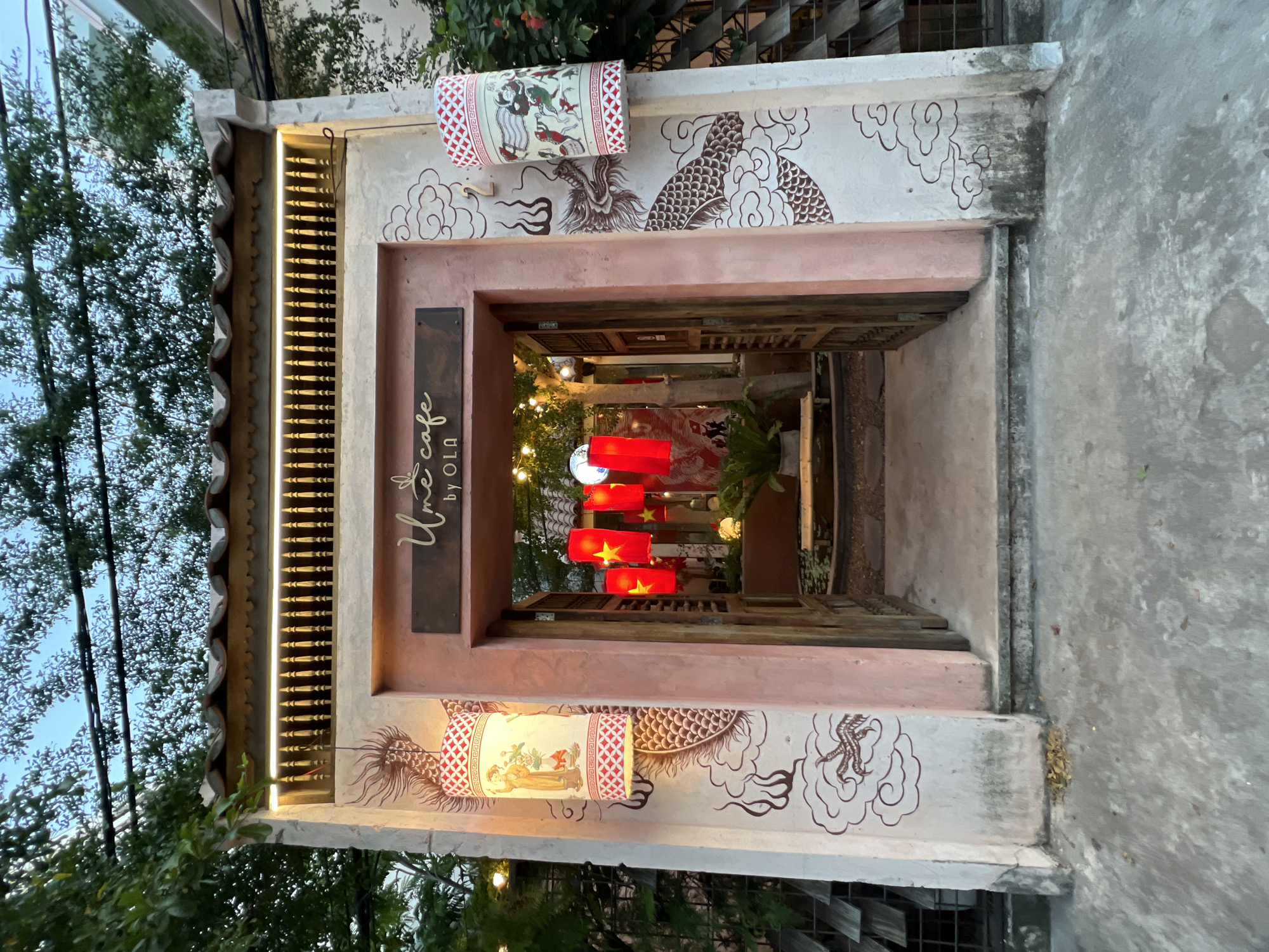 This image depicts the illuminated entrance to "Ume cafe by OLA" in Nha Trang, Vietnam, at twilight