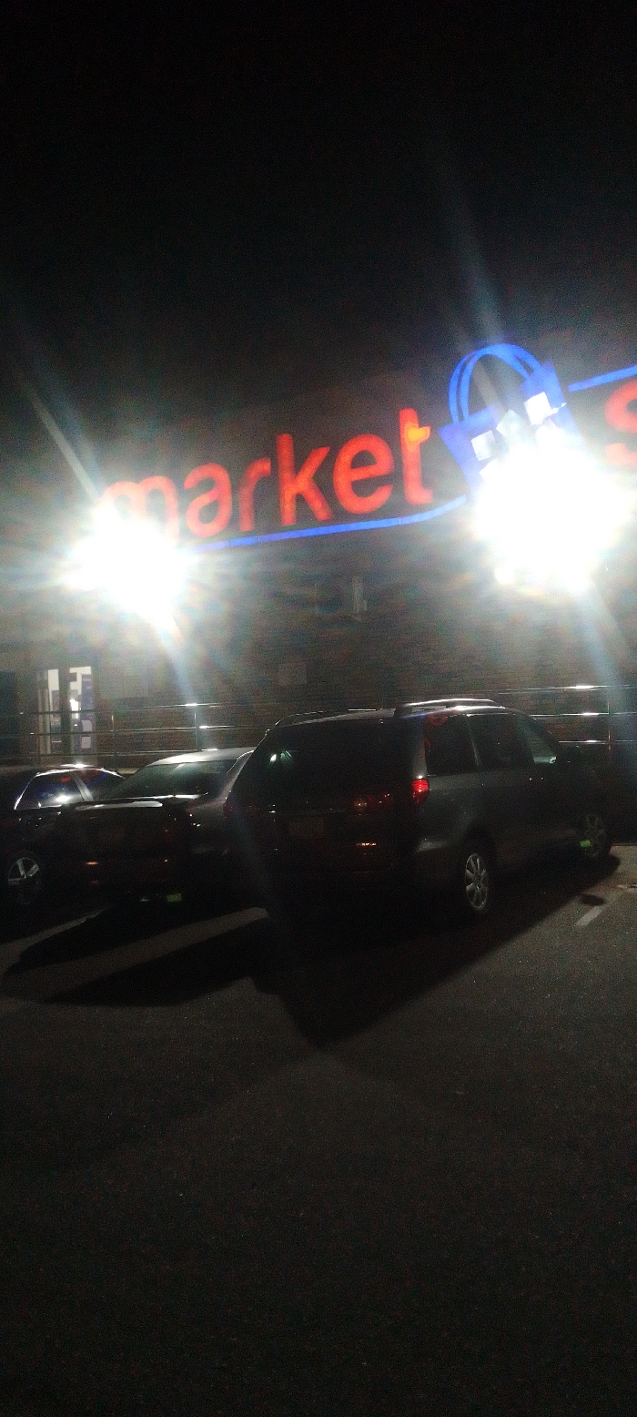 nighttime scene of a parking lot in front of a store. The store has a sign with the word "market" in red letters and a blue outline. There are three cars parked in the lot, with the rear of two visible. One of the cars is a dark SUV. The scene is lit by overhead lights, creating bright spots in the parking lot. It appears to be in front of a "Market" store in New Karu, Nigeria. The coordinates given (latitude: 8.991, longitude: 7.57) correspond to a location in New Karu. There is a metal railing visible in the foreground. The image is taken at a low angle.