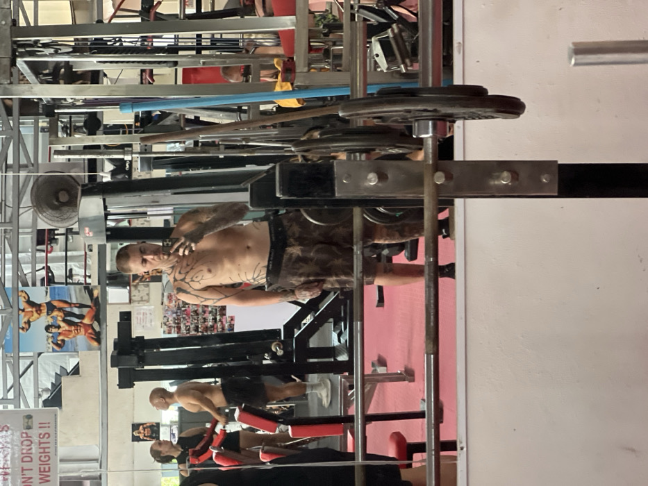 A shirtless man with tattoos poses in a gym mirror. He wears patterned shorts and looks at his phone. Behind him, other gym-goers exercise on machines. Weight plates are stacked on a barbell in the foreground, slightly obscuring the view. Posters and signs decorate the gym walls, including one cautioning against dropping weights. Metal gym equipment is visible throughout the space.