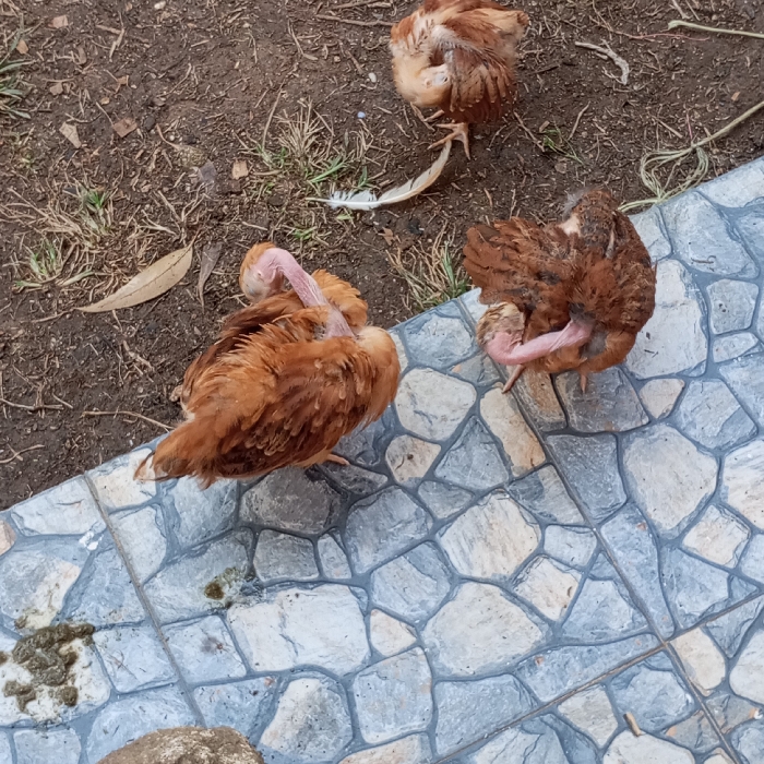 The image depicts an outdoor scene in Mahiakalo ward, Kenya, featuring three reddish-brown domestic chickens situated on a transition between unpaved dirt ground and a paved area. **Subjects:** 1. **Chicken 1 (left foreground):** A reddish-brown chicken with a prominent pink, featherless neck. Its head is turned back, engaged in preening its back feathers. It stands on the tiled surface. 2. **Chicken 2 (right mid-ground):** Another reddish-brown chicken, also exhibiting a pink, featherless neck. Its head is similarly turned back, appearing to preen its body. It stands on the tiled surface near the edge of the dirt. 3. **Chicken 3 (top right background):** A smaller reddish-brown chicken, partially obscured, with its head tucked into its body, resting or preening. It is positioned predominantly on the dirt ground. **Environment and Objects:** The scene is divided into two primary surfaces: * **Left and top section:** Unpaved dark brown dirt ground with sparse, dry green grass, small twigs, and a single dried, elongated leaf (possibly eucalyptus) visible on the left. A single white feather lies on the dirt ground near the top chicken. * **Bottom and right section:** A tiled surface featuring irregular, interlocking mosaic-style tiles in shades of grey, blue, and light brown. * **Droppings:** Two distinct piles of dark green and white chicken droppings are visible on the tiled surface in the bottom-left quadrant. * **Bottom edge:** A fragment of a natural rock or similar object is visible at the very bottom center edge of the frame. The lighting suggests an overcast day or shaded area, without harsh shadows. The perspective is from above, looking down on the subjects.