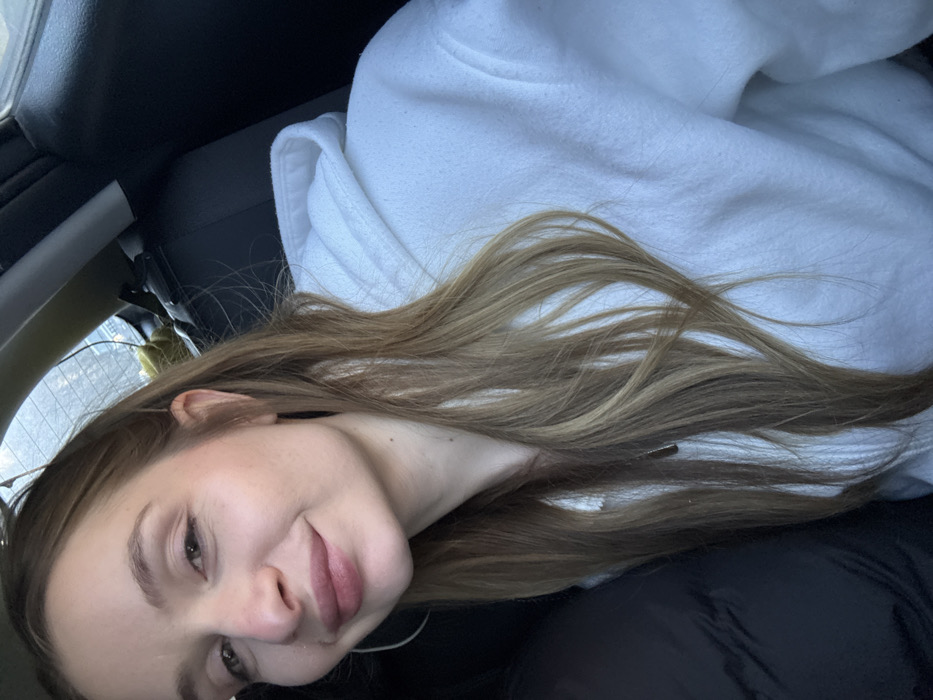 female subject seated inside a vehicle, likely in the city of Unknown, Montenegro. The subject, viewed in a close-up selfie, looks directly at the camera with a slight smile. She has long, light brown hair with blonde highlights, parted roughly in the center and flowing over her shoulders and chest. She is wearing a white hooded sweatshirt and silver-colored hoop earrings are visible on her left ear. To her left, a dark-colored object, possibly a seat or clothing item, is partially visible. Behind her right shoulder, a dark car seat or headrest is present, with a portion of a seatbelt mechanism also visible. Through the rear window of the vehicle, a blurred background suggests outdoor elements and daylight conditions.