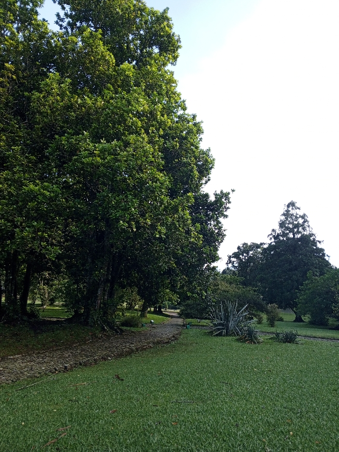 A serene park scene features lush green grass leading to a winding stone path. Towering trees with dense foliage dominate the left, casting shade. To the right, various plants and trees dot the landscape, including a distinctive agave. A large, pyramidal tree rises in the distance. The sky is mostly clear, suggesting a bright day.