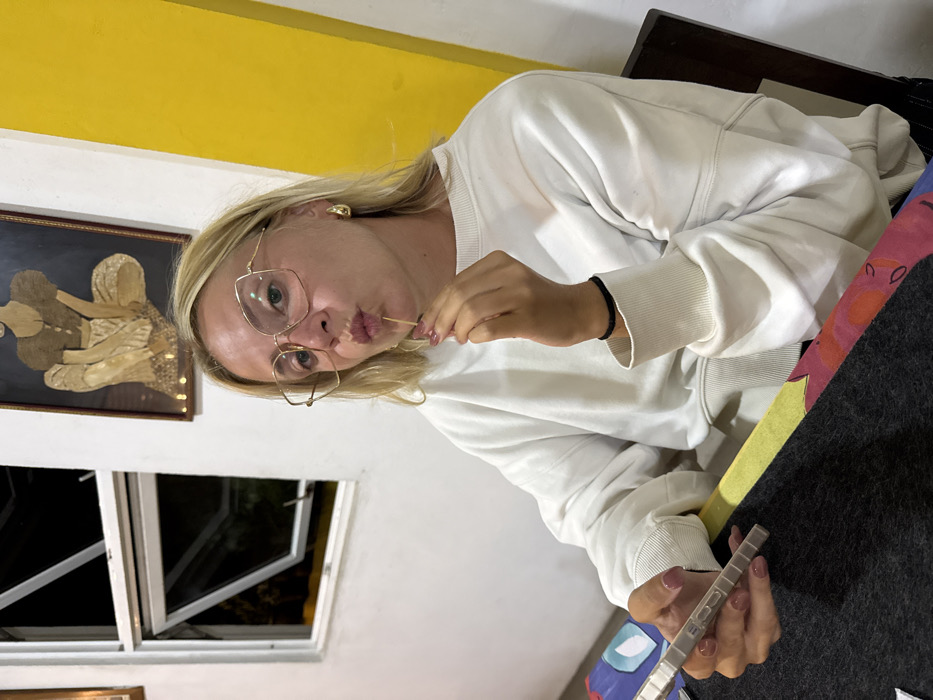 The scene depicts an interior setting at night in the city of Bentota, Sri Lanka, featuring a blonde female seated at a table. The subject, a woman with medium-length blonde hair, is wearing large gold-framed hexagonal glasses and a white crewneck sweatshirt. She has pink nail polish on her fingernails and a black elastic band on her right wrist, which also features a gold hoop earring. Her lips are pursed forward, and she is looking directly at the camera. Her right hand holds a wooden toothpick to her mouth, while her left hand cradles a light-colored smartphone with a textured case, held horizontally over a dark table surface. The table is adorned with a colorful fabric or placemat featuring abstract yellow, pink, blue, and red shapes. The background consists of white walls, with a section of bright yellow wall on the right. An open white-framed window reveals exterior darkness, indicating nighttime. Above the subject, a framed artwork depicting a seated female figure, possibly crafted from straw or woven material on a dark background, hangs on the white wall. A dark wooden chair backrest is visible behind the subject.