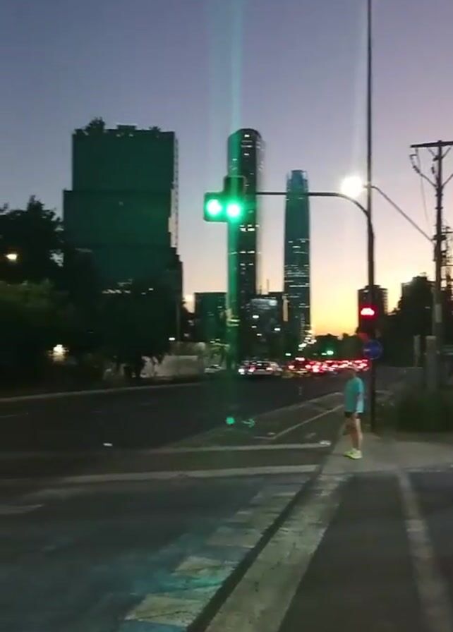 city intersection at dusk. The sky is a mix of light blue and orange, with tall buildings silhouetted against it. Several buildings have lights on, and one skyscraper dominates the skyline. A traffic light is visible, showing a green light for traffic going straight ahead. A man stands on the corner, waiting to cross. A motorcycle is stopped at the red light, waiting for it to turn green. The camera pans to the right, revealing a park-like area with trees and streetlights.