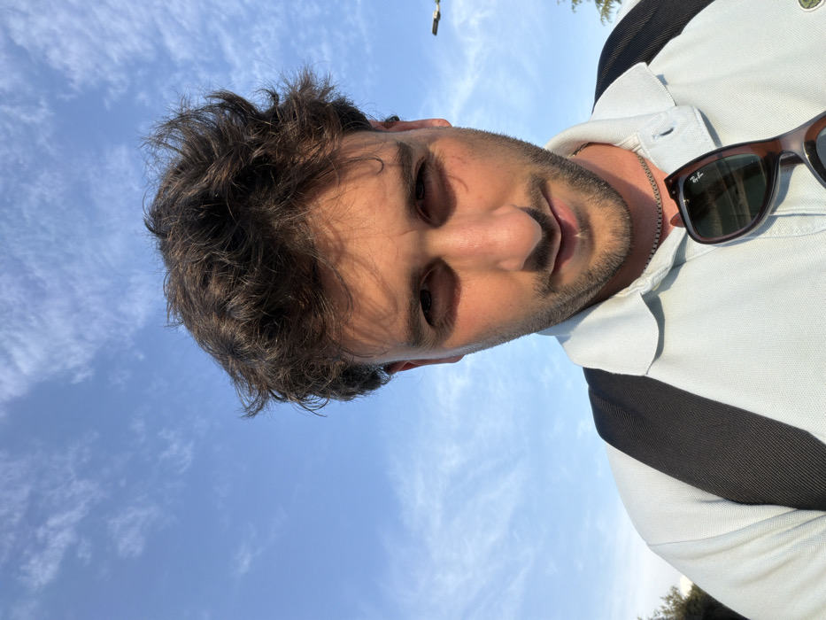 A man, slightly angled, is the focal point against a blue, cloudy sky. He has dark hair, brown eyes, and light skin. He is wearing a white polo shirt with black stripes on the shoulders. Sunglasses are positioned on the shirt's collar. The image is brightly lit, casting shadows across his face. His gaze is directed toward the camera.