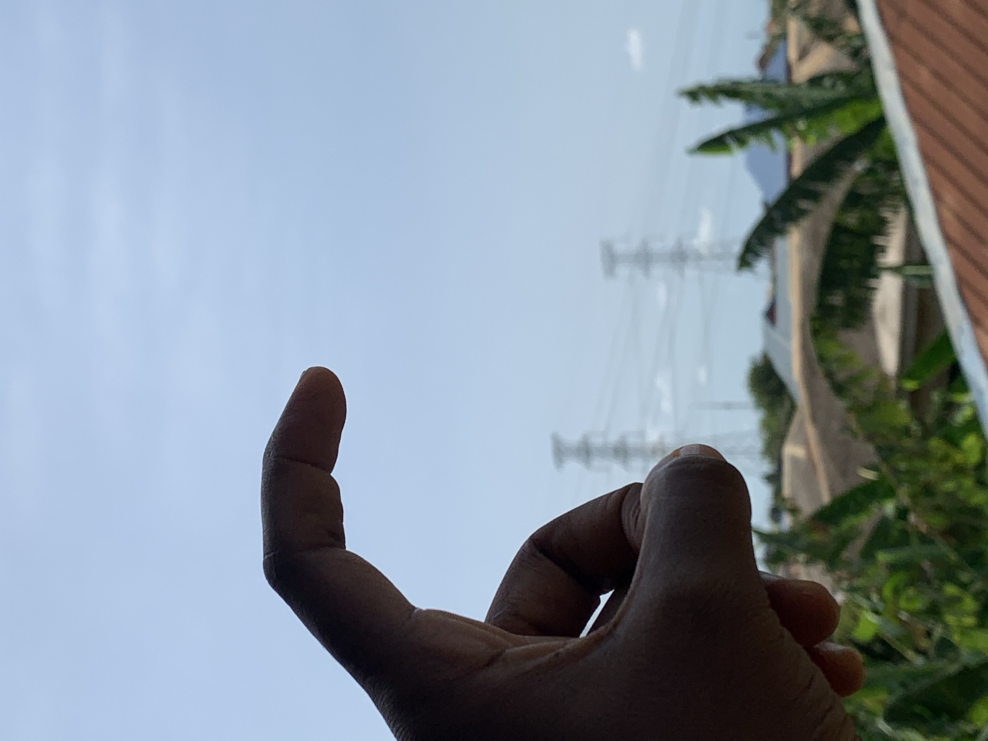 A hand is visible in the lower left corner of the image, with its index finger extended upwards. The background features a clear sky and power lines. There is greenery, including what appear to be palm trees, as well as the corner of a building, possibly a house or apartment, on the right. The location is identified as Ikorodu, Nigeria, although specific details to confirm the location within the city are not apparent in the image.