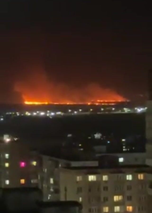 nighttime view of a cityscape, with a large fire burning in the distance. The fire appears to be spread across a wide area, with visible flames and smoke rising into the air. The sky above the fire is dark, and the surrounding area is illuminated by the glow of the flames. In the foreground, there are several tall buildings, silhouetted against the night sky. Some lights are visible on the buildings. The camera is static.