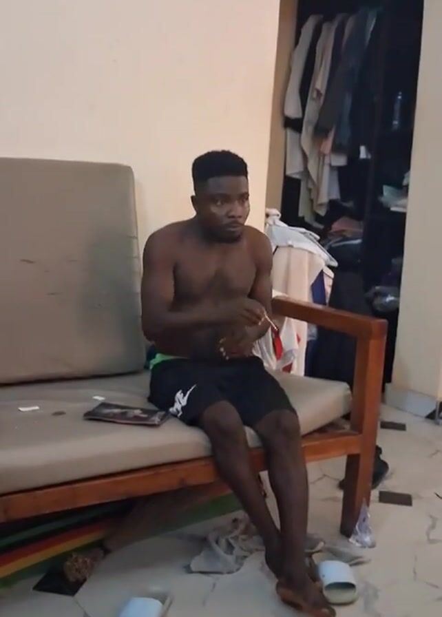 A shirtless man is sitting on a small couch in a room. He is dark-skinned, with short dark hair and a slight mustache. He is wearing black shorts with a white logo. He is holding a small object in his hands and appears to be examining it. The couch is made of wood and has a beige cushion. There is a phone sitting on the cushion to his left. Behind him is a dark, open closet with various items hanging inside. The floor is tiled in a geometric pattern of white and black. A pair of white slippers are on the floor near the couch. There is trash and other objects scattered on the floor. The walls are beige.