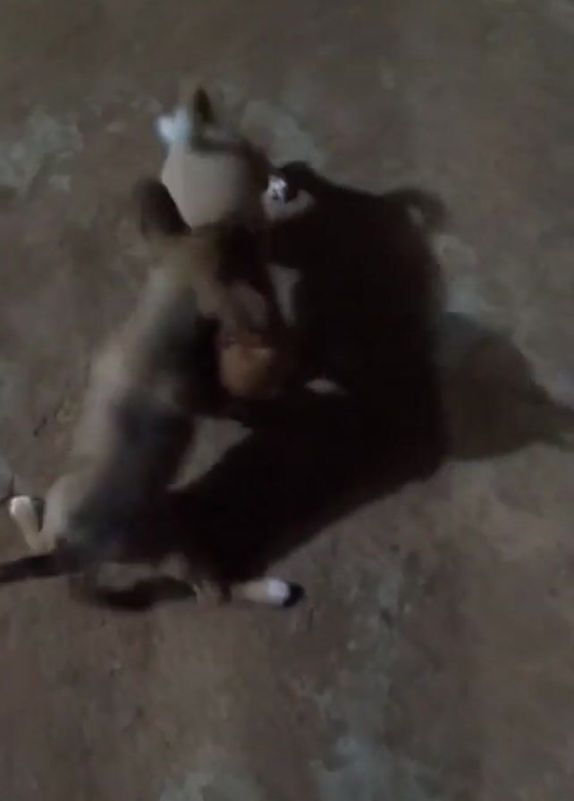 Two puppies are wrestling on a dirt surface. The puppies are blurry and appear to be brown and tan in color. Their shadows are visible on the surface. A person's foot appears briefly in the lower right corner. An adult voice can be heard in the background.