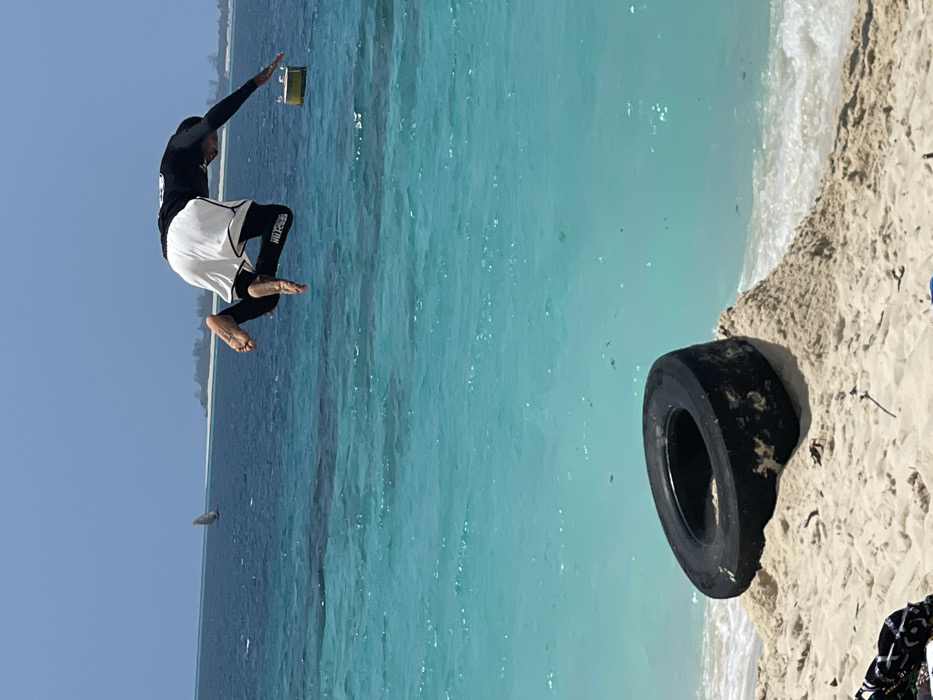 The image depicts an outdoor daytime coastal scene in Zanzibar, Tanzania. A single individual is captured mid-air, suspended horizontally above clear turquoise ocean water, in the process of performing a dive or flip. The person wears a black long-sleeved top, white basketball shorts over black compression pants, and has bare feet. Their head is oriented towards the right of the frame, with legs bent and feet positioned to the left. In the lower-left foreground, a large black tire rests on a mound of white sand on the beach. To the right of the airborne individual, a yellow cylindrical buoy floats on the ocean surface. In the distant, deeper blue ocean, a traditional sailing vessel, specifically a dhow with a triangular sail, is visible. A low, vegetated landmass forms the horizon line. The sky above is clear and bright blue. The ocean water exhibits a gradient from light turquoise in the shallows near the beach to a darker blue in the deeper background. The water surface shows minor ripples and appears to contain some sparse floating debris.