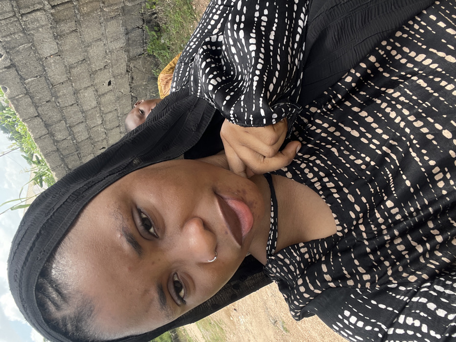 The image displays an outdoor scene in Zango-ndaji, Nigeria, featuring two individuals. In the foreground, a young adult female with medium-dark skin is shown, looking directly at the camera. She wears a black head covering that reveals braided hair along her forehead and a long-sleeved garment featuring a black background with a pattern of scattered light-colored dashes or dots. A small silver-colored ring is visible in her left nostril. Her right hand is positioned at her neck, seemingly touching or adjusting her attire. Her lips are tinted reddish. Partially visible behind and to the right of the primary subject is a second individual, likely a child, wearing a light brown or orange patterned garment, with only their head and upper torso discernible. The background features a grey concrete block wall with visible mortar lines, topped by green foliage. The ground in the left foreground consists of light brown earth. The sky above is light blue with scattered white clouds.