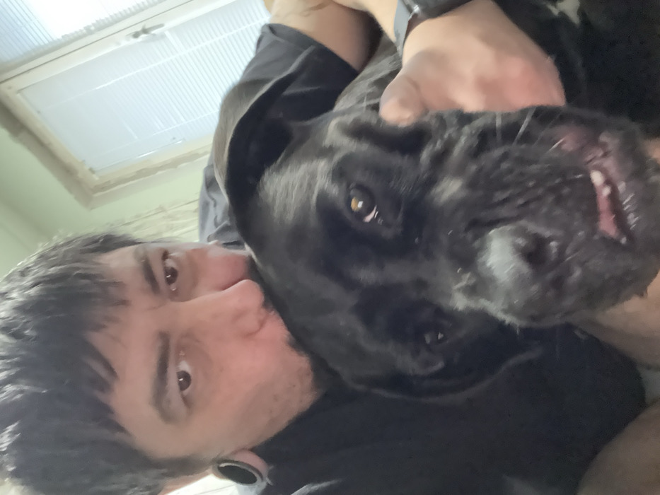 - "The image depicts a close-up, indoor scene featuring one adult male and one large black dog" by FM-8m4I83, licensed under CC BY 4.0