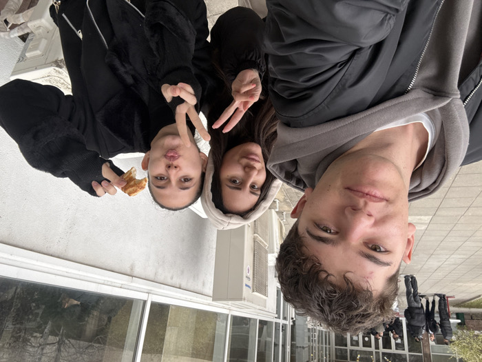 The image presents a selfie featuring three young adults outdoors on a paved area, likely a university campus in Sofia, Bulgaria