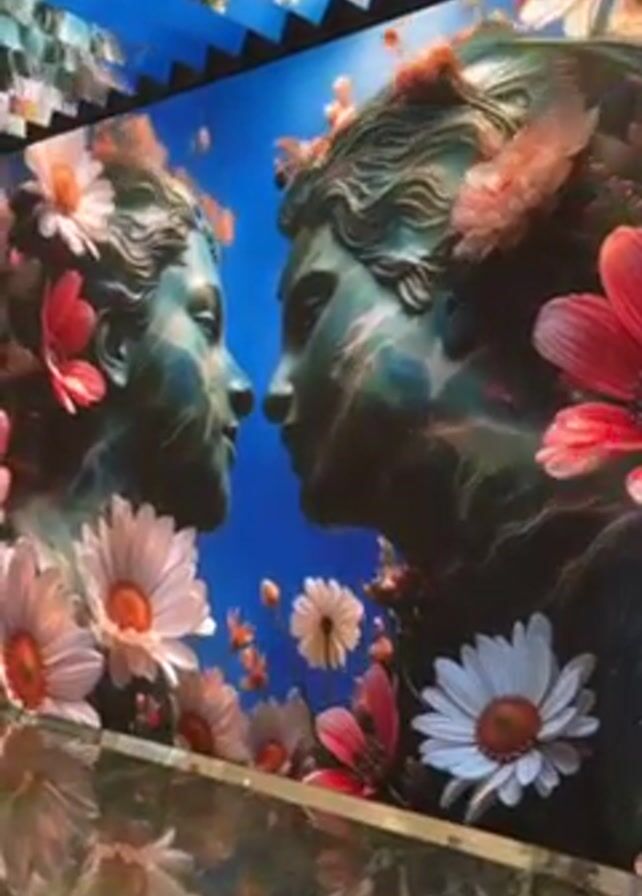 person walking past a kaleidoscopic display of a large mural. The mural depicts two statuesque figures facing each other, surrounded by colorful daisies and other flowers against a bright blue sky. The kaleidoscopic effect is created by multiple angled mirrors or reflective surfaces, which repeat and fragment the mural’s image. A man wearing a dark blue collared shirt walks into view briefly, then out of frame, as the camera stays focused on the mural.