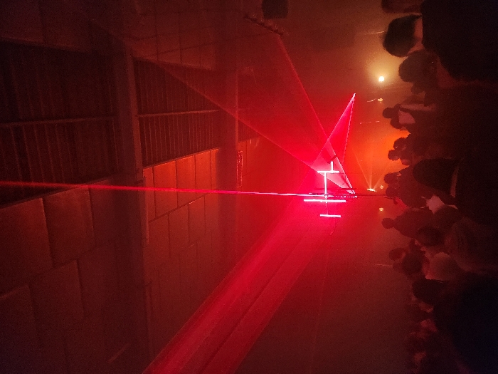 A vibrant laser light show bathes a crowded venue in red. The spectacle features intersecting beams that form sharp geometric shapes, like a cross and triangles, reflecting off a mirrored surface. Silhouetted figures watch the performance from the right side, their faces obscured by darkness. The venue's architecture, including wall panels and beams, is partially visible, also tinted red from the light.