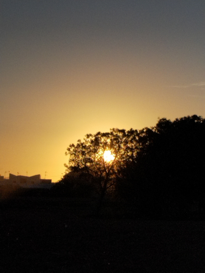 A silhouette of a tree is set against a sunset. The sun, a bright orb, shines through the tree's branches. Houses are visible in the distance, with the sky a gradient of yellow near the horizon to a darker blue above. The foreground is dark, giving the scene a stark contrast between light and shadow. The focus is clearly on the tree and the setting sun.