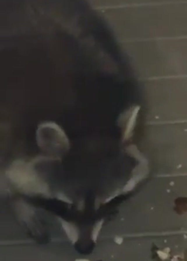 raccoon eating scattered food from a wooden-planked surface. The raccoon is mostly gray with a white muzzle and ear tips, and its black striped markings are visible. The food includes small, white pieces, and some dark red chunks. The raccoon is focused on picking up and eating the food. Background sounds of speech and music are audible.