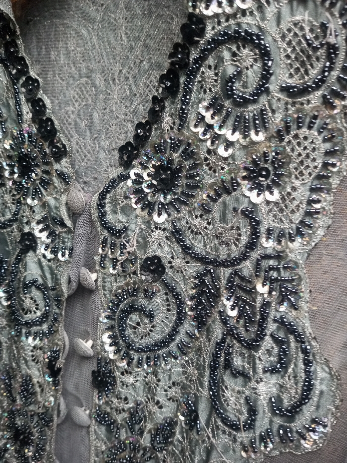Close-up of a garment, possibly a blouse or dress, showcases intricate beaded and sequined embellishments. Dark beads and silvery sequins form swirling patterns and floral motifs against a soft, semi-sheer fabric. The texture of the fabric appears delicate and finely woven. Small, fabric-covered buttons are visible along the edge, adding to the garment's refined appearance. Overall, the image highlights the craftsmanship and detailed ornamentation of the piece.