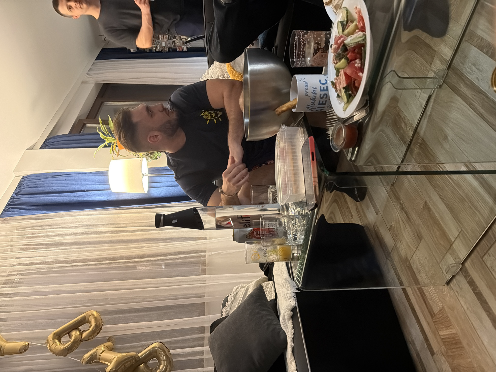 A room scene shows two men at a glass table with food and drinks, including a salad, various containers, a bottle of beer, and glasses. One man is sitting at the table, the other is standing to the side. A sofa with a gray pillow is next to the table. Behind them are white curtains and blue drapes. Gold balloon decorations are visible against the curtain. A floor lamp is also present. The location is likely Sofia, Bulgaria, but that cannot be confirmed from the image.
