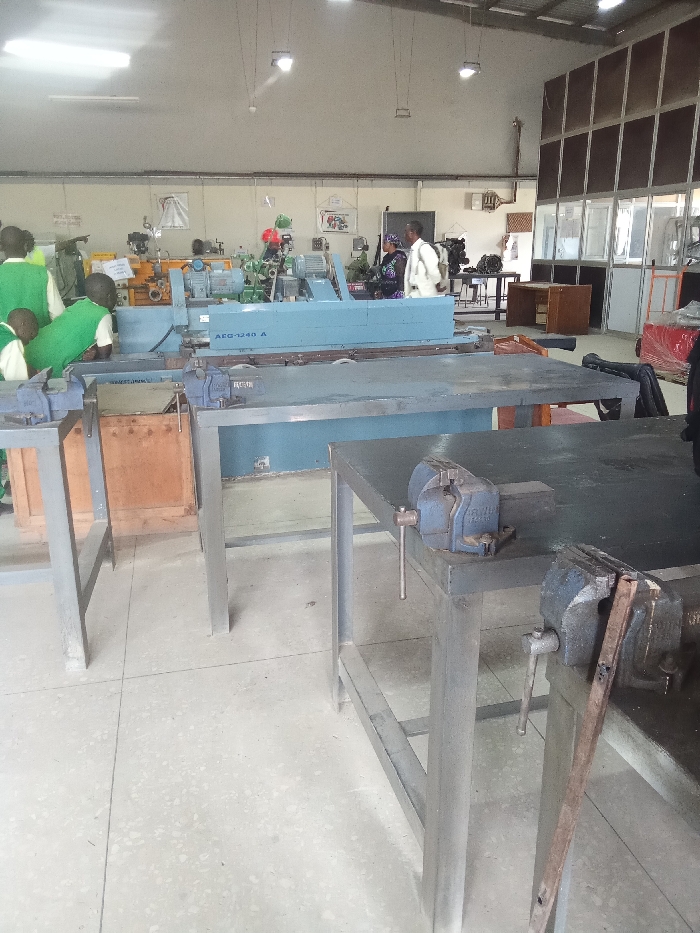The image displays an industrial or vocational workshop situated in Jos, Nigeria