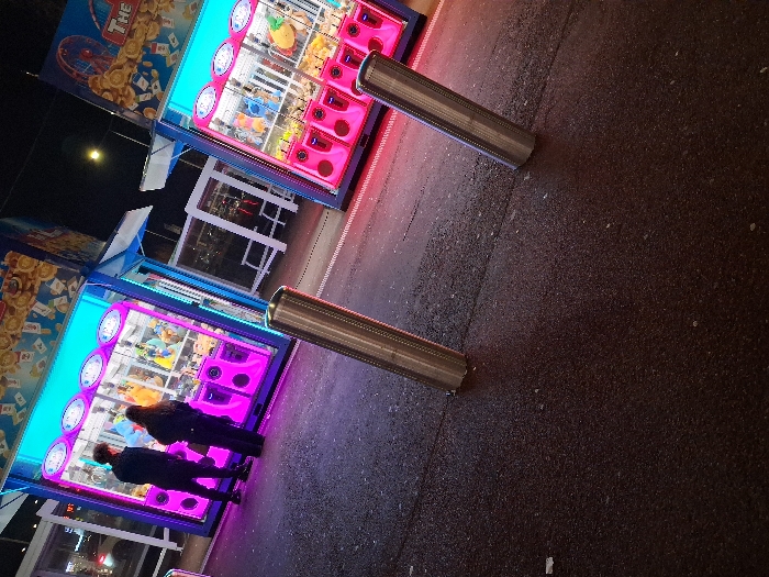Two claw machine arcade games stand side-by-side at an outdoor venue, illuminated with bright pink and teal lights. A couple is seen playing one machine. Cylindrical bollards are between the machines and the dark asphalt ground. The night sky and overhead lighting suggest an evening setting. A building is faintly visible in the background.