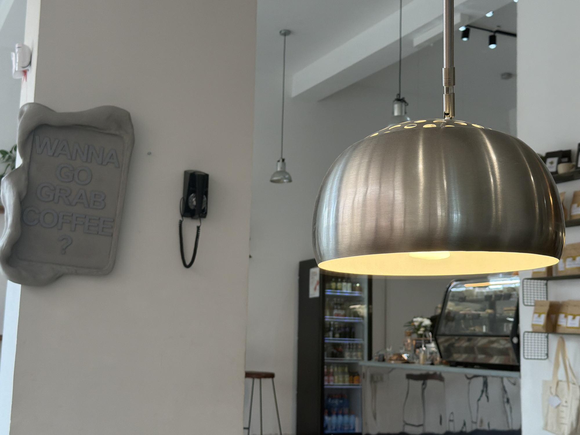 The image depicts the interior of a café or coffee shop in Brasov, Romania. The foreground is dominated by a large, brushed-metal pendant light fixture with a glowing bottom. To the left, mounted on a white wall, is a decorative sign that reads "WANNA GO GRAB COFFEE?". Next to it is an old-fashioned black telephone also mounted on the wall. In the background, partially obscured by the light fixture, is a cooler filled with beverages. A service counter with pastries in a display case and a shelf holding items for sale is also visible. A single stool is partially visible near the cooler. The overall impression is a modern café interior with decorative elements.