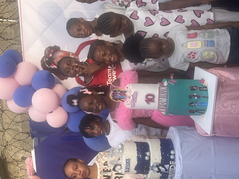 A group of young girls, including the birthday girl, pose with two tiered cakes. The taller cake is turquoise and white with a “10 Ayomikun” message and fashion-themed decorations. The other cake is navy and white with spherical accents and a "Bluelock" decoration. Pink and blue balloons decorate the background. A backdrop displays a younger photo of the birthday girl. The girls wear casual clothing and smiles.