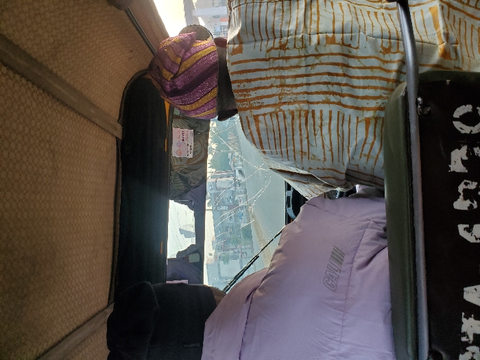 An interior view from within a vehicle. A patterned curtain hangs overhead, while a purple jacket rests on a dark object. A window offers a view of a coastal cityscape and the ocean. A striped hat is placed near the window. The setting appears to be cramped, with various belongings stored within the vehicle.