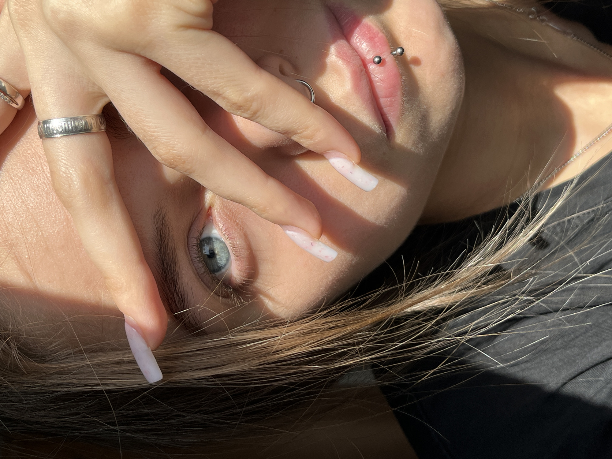 A close-up, tilted portrait shows a person's face partially obscured by their hand. The visible eye is blue-gray. The person has a lip piercing with a stud. A nose ring is also visible. The hand has long, painted fingernails. Two rings are on the person's left ring finger, one silver with a patterned design. Loose, light-brown hair falls across the lower portion of the frame. The person is wearing a dark-colored garment. The location is assumed to be Фоки, Russia as a query parameter.