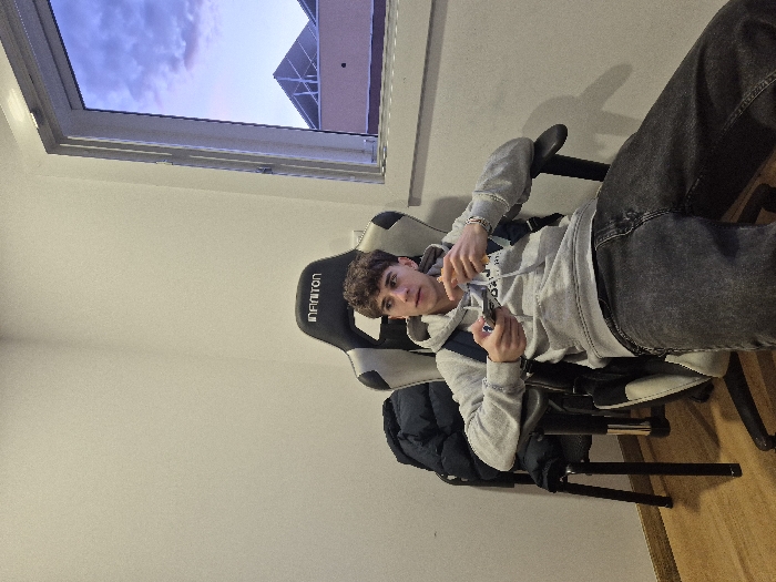 An indoor scene depicts a young male seated in a black and grey "INFINITON" brand gaming chair. He has short, curly dark hair and wears a light grey hooded sweatshirt, dark wash jeans, and a dark backpack. A silver-colored bracelet is visible on his right wrist. In his left hand, he holds a light-colored mobile device. His right hand is partially raised, with fingers slightly curled, holding or gesturing with a small, indistinct object. His gaze is directed towards the upper right of the frame. A dark padded jacket is draped over an adjacent black chair to his left. The room features light-colored walls and a light brown wooden floor. Through a window on the right, the exterior sky is visible, displaying blue and purple hues with clouds, indicative of dusk or dawn. Below the sky, the upper sections of buildings are discernible, characterized by repeated, angular, possibly sawtooth or multiple gable roofs against a light orange/beige facade. This architectural style suggests an urban or suburban setting within Bragança, Portugal, but specific landmarks for precise location identification are absent.