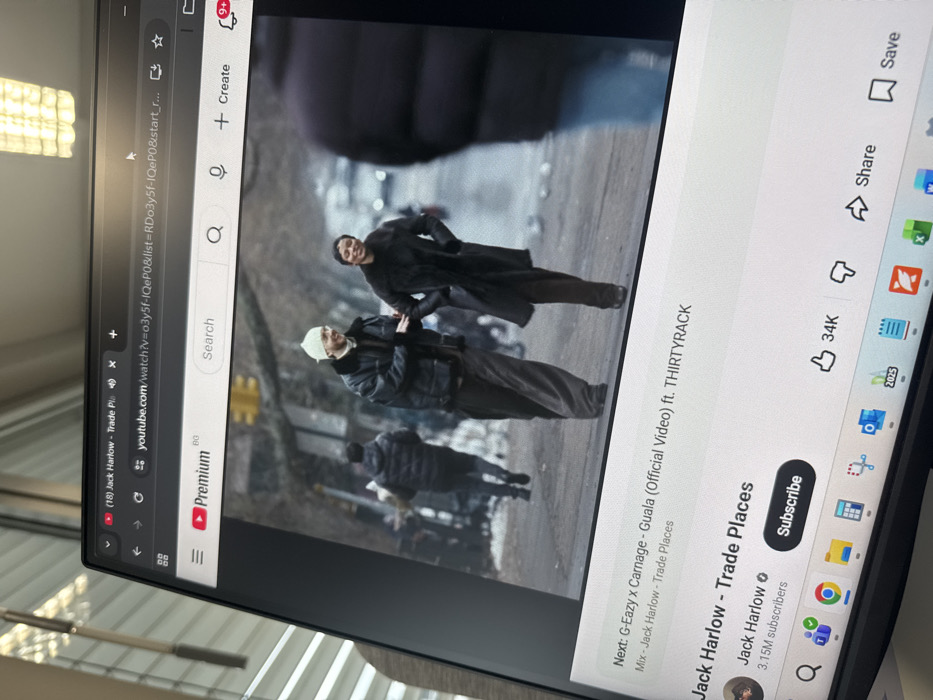 The image displays a close-up, slightly angled view of a black laptop screen, which is actively presenting a YouTube video. The video, titled "Jack Harlow - Trade Places," shows a street scene in what appears to be cold weather. Two individuals are prominent in the video frame: a male with a light-colored beanie, glasses, a dark puffer jacket, and wide grey pants, smiling while walking arm-in-arm with a female wearing a dark fur-trimmed coat and dark pants, also smiling. Blurred figures and a yellow traffic light are visible in the background, suggesting an urban environment. The laptop's Google Chrome browser displays "youtube.com/watch?v=o3y5f-IQeP0" in the address bar. A "YouTube Premium BG" label is visible, with "BG" indicating the Bulgarian regional setting for the platform. Below the video, details include "Jack Harlow" with "3.15M subscribers" and a "Subscribe" button, alongside a "34K" likes count. The Windows taskbar at the bottom of the screen shows various application icons, including Microsoft Teams, Chrome, File Explorer, Calculator, and Microsoft Office suite programs. To the immediate left of the laptop screen, vertical blinds are partially visible through what appears to be a window. Above the screen, a rectangular light fixture with a grid pattern is partially visible or reflected. Based on the "BG" regional indicator within the YouTube interface, the scene, specifically the location where the laptop is being used, is identified as being in Sofia, Bulgaria.