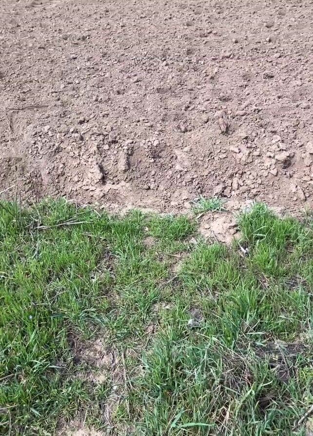 The video presents a scenic view of farmland, transitioning from a close-up of grass at the base to a broad panorama of fields under a blue sky with scattered clouds. Initially, the camera focuses on a patch of green grass, before tilting upwards to reveal a freshly tilled brown field. As the camera continues to pan upwards, a contrasting field of green crops comes into view in the distance. The scene concludes with a shot of the landscape, showcasing both the tilled and cultivated fields under the bright, blue sky.