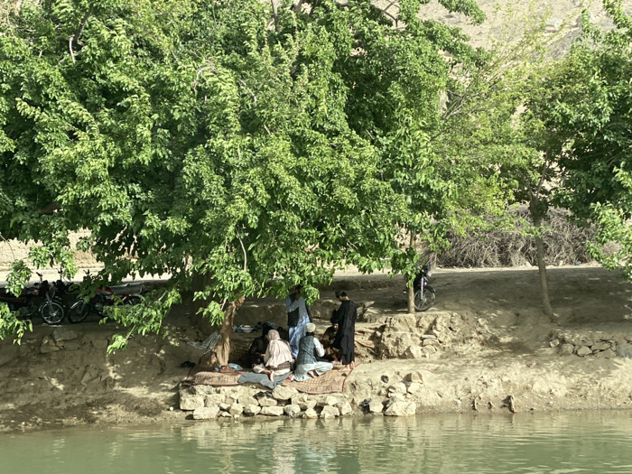 The scene is located in Sard-E 'olya, Afghanistan, at coordinates 31.707 latitude and 65.705 longitude. It depicts a group of six men sitting on a woven mat, partially obscured by a large tree, on the edge of a river. The men are all dressed in traditional clothing, and they appear to be relaxing and talking. Some of the men have their backs turned towards the viewer. There are several motorcycles parked behind the men. The environment is a rugged landscape, with a dirt bank and a rocky riverbed. The river is calm and clear, and the sky is partially obscured by the trees.