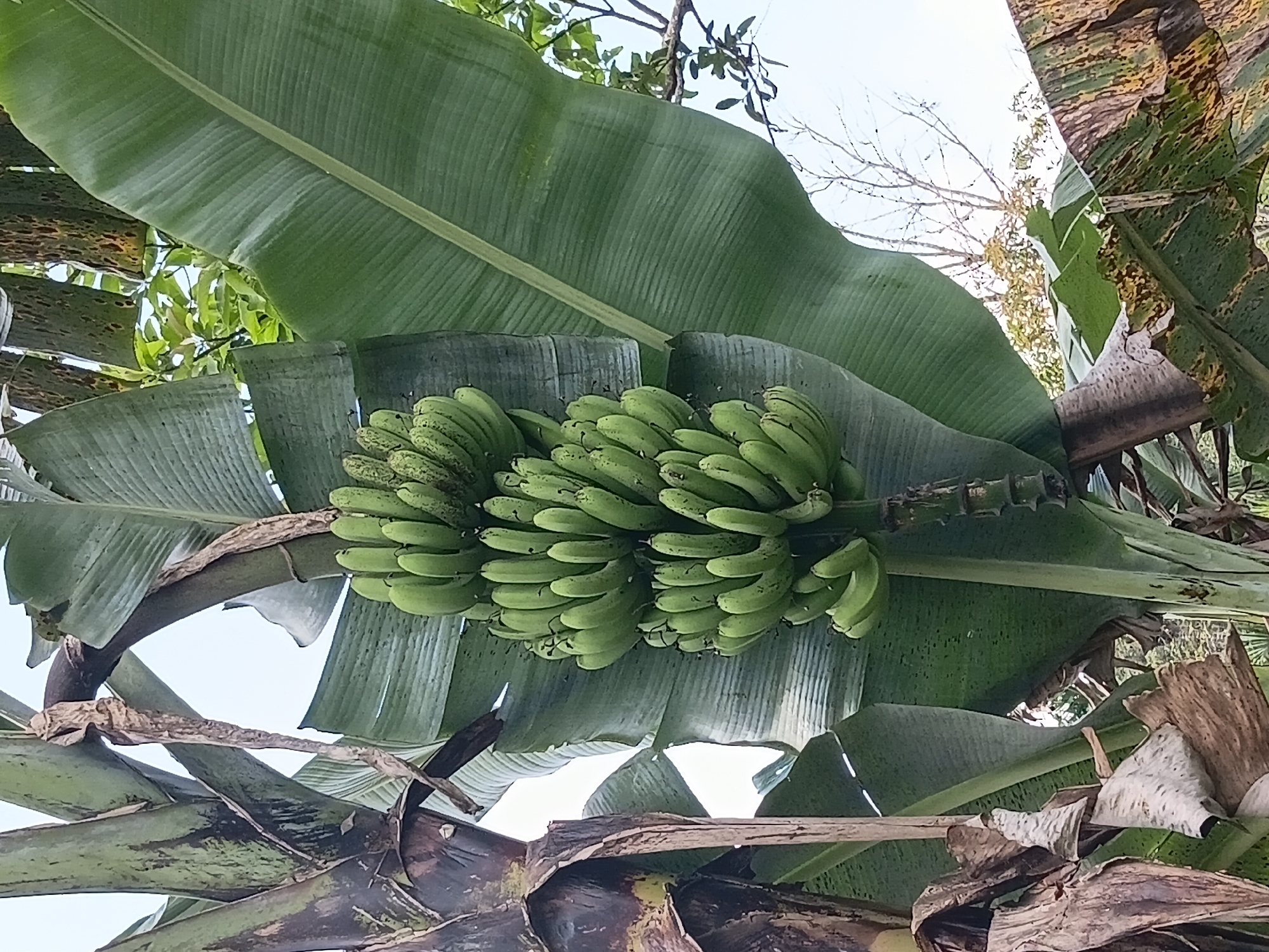A low-angle, close-up photograph depicts a large cluster of green, unripe bananas hanging from a banana plant in Ulunaron, Indonesia. The central subject is a robust bunch of approximately five to six hands of bananas, varying in size, all displaying a consistent light green color indicative of immaturity. Minor dark speckling is visible on the surface of some individual fruits. The bananas are suspended from a thick, green stalk. Surrounding the fruit and stalk are several large, paddle-shaped banana leaves; some are deep green and appear healthy, while others exhibit signs of age and wear, including brown edges, tears, and mottled yellow-brown discoloration. To the left, a segment of the banana plant's pseudostem is visible, characterized by layers of dried, brown, fibrous leaf sheaths. The background shows areas of bright, diffused sky and sparse glimpses of other tree foliage, some green and some bare-branched, under natural daylight conditions. No human presence or artificial objects are depicted.
