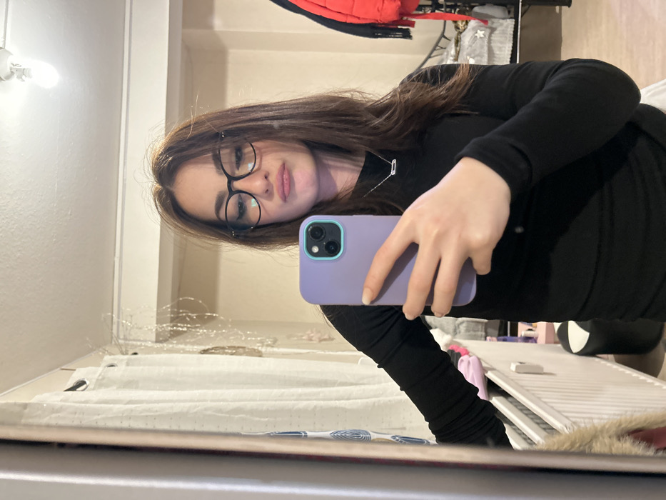 A person takes a mirror selfie, holding a lavender phone